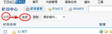 注意:由于本系統(tǒng)采用了html純靜態(tài)生成技術(好處多多),你可能在修改資料或新增資料的時候,見不到效果,在這種情況下,你可以回到“欄目中心”,按照下面的圖示,先點全選,再點生成,刷新下你修改的那個欄目或文章就可以了,如果只是想見到修改后的某一篇文章或產(chǎn)品頁面有沒效果,修改完后,刷新下你的文章或產(chǎn)品頁就行,文章或產(chǎn)品頁在修改后就已經(jīng)自動生成了。