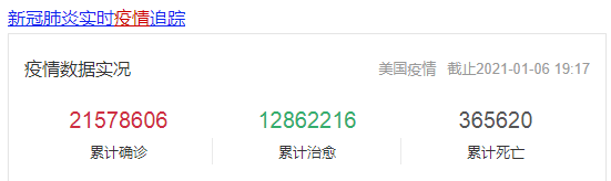 截止2021年1月6日,美國累計確診病例高達(dá)2178萬人,累計死亡人數(shù)超過36萬。