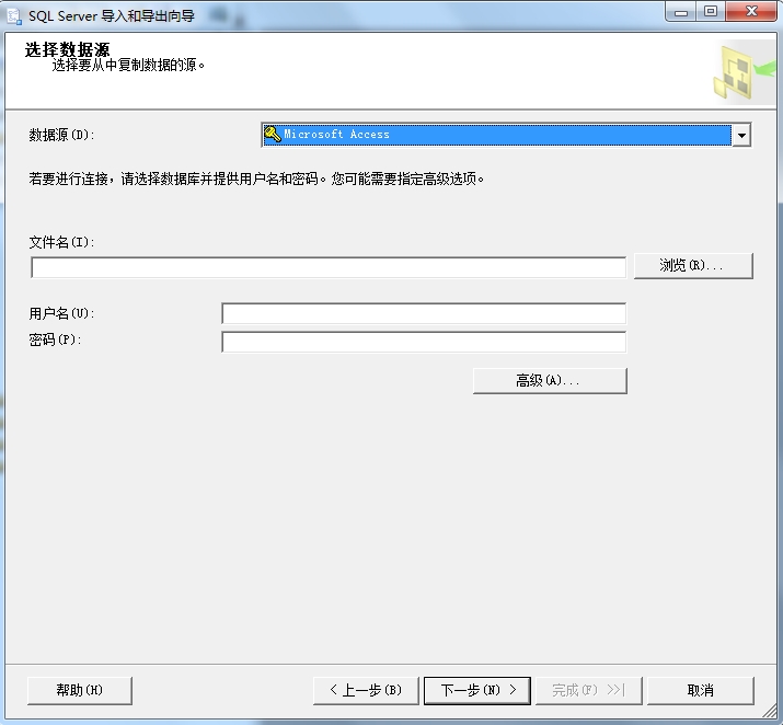 數(shù)據(jù)源中選擇 Microseoft Access,點(diǎn)擊文件名右側(cè)的瀏覽,選擇準(zhǔn)備好的access數(shù)據(jù)庫(kù)文件,用戶名跟密碼可以不用填寫,點(diǎn)擊下一步;