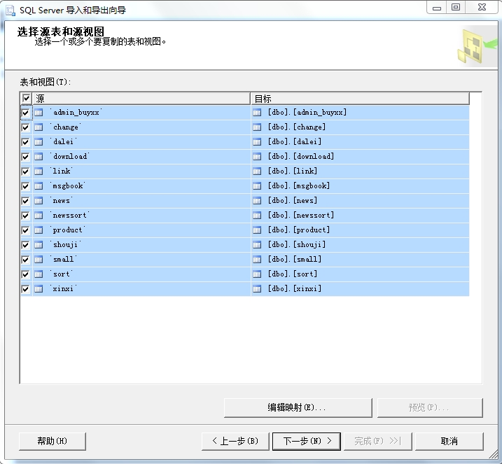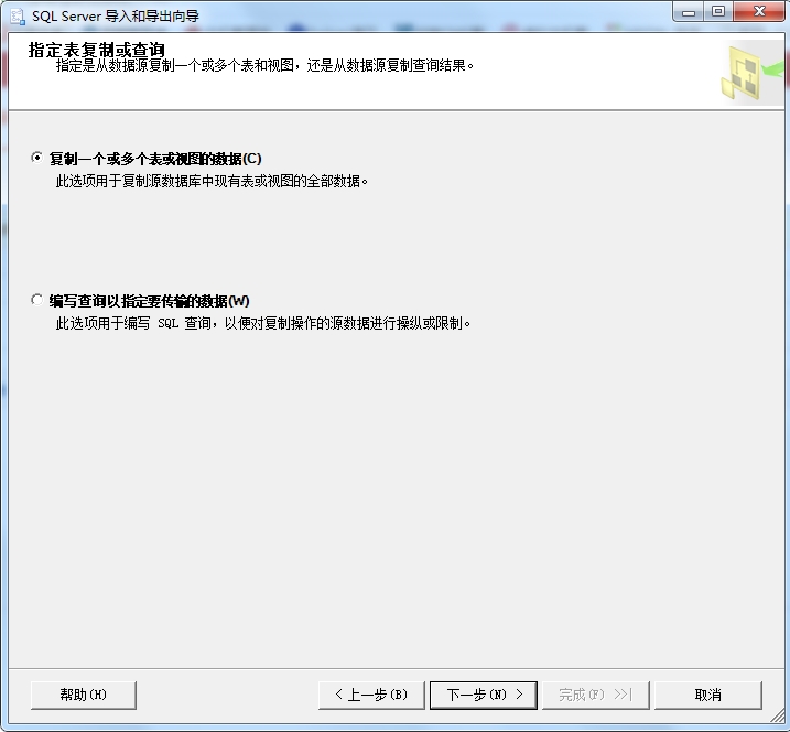 選擇復(fù)制一個(gè)或多個(gè)表或視圖的數(shù)據(jù),點(diǎn)擊下一步;
